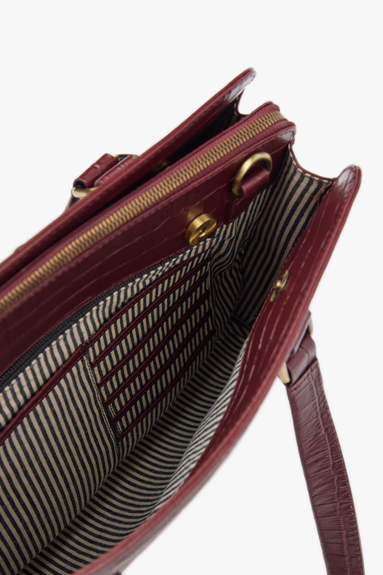 In Kersenrood Croco Print Leer is Blair een echte statement piece voor drukke werkdagen. Draag haar over je schouder of met de afneembare crossbody strap – veelzijdigheid is key. Binnenin vind je een gevoerd laptopvak, een sleutelclip, meerdere vakken én twee ruime hoofdcompartimenten voor je notitieboek, portemonnee, waterfles en meer. Blair is de stijlvolle work bag die moeiteloos met je meebeweegt.