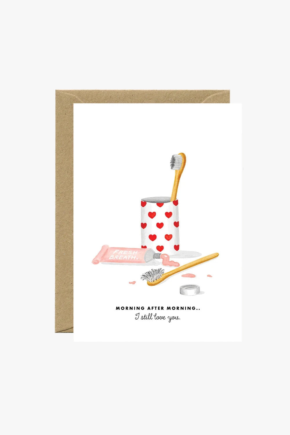 Celebrate the beauty of everyday life with the Morning after morning — Greeting card by All The Ways To Say. This sweet watercolor illustration of shared toothbrushes and heart-patterned decor captures the quiet intimacy of waking up next to the same person day after day. It is the perfect choice for an anniversary, Valentine’s Day, or a simple reminder that your love is as fresh as ever, even before the first coffee.