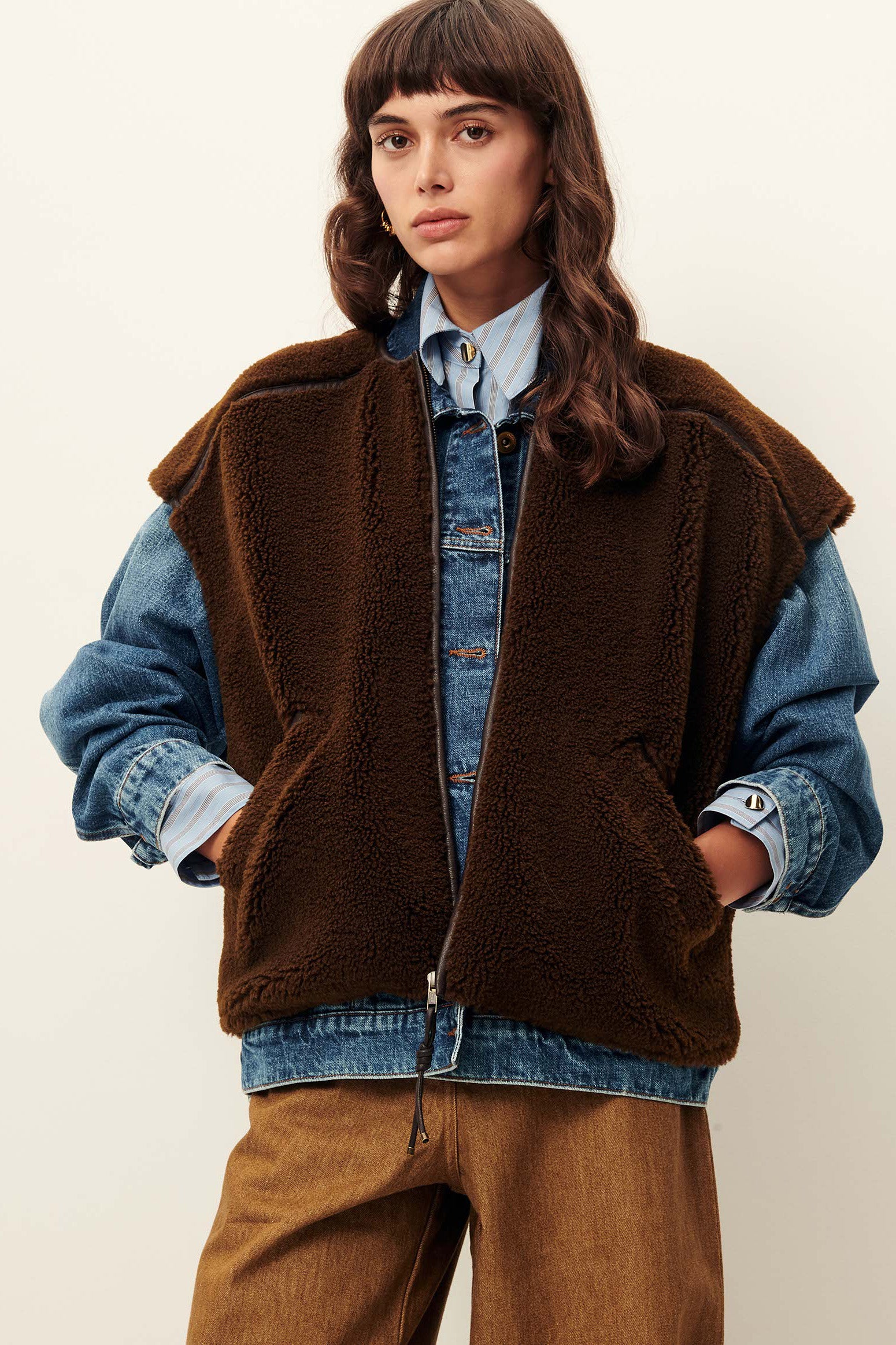 Sleeveless jacket in faux sheepskin effect double weave boucle yarn. Contrasting faux leather trimming.