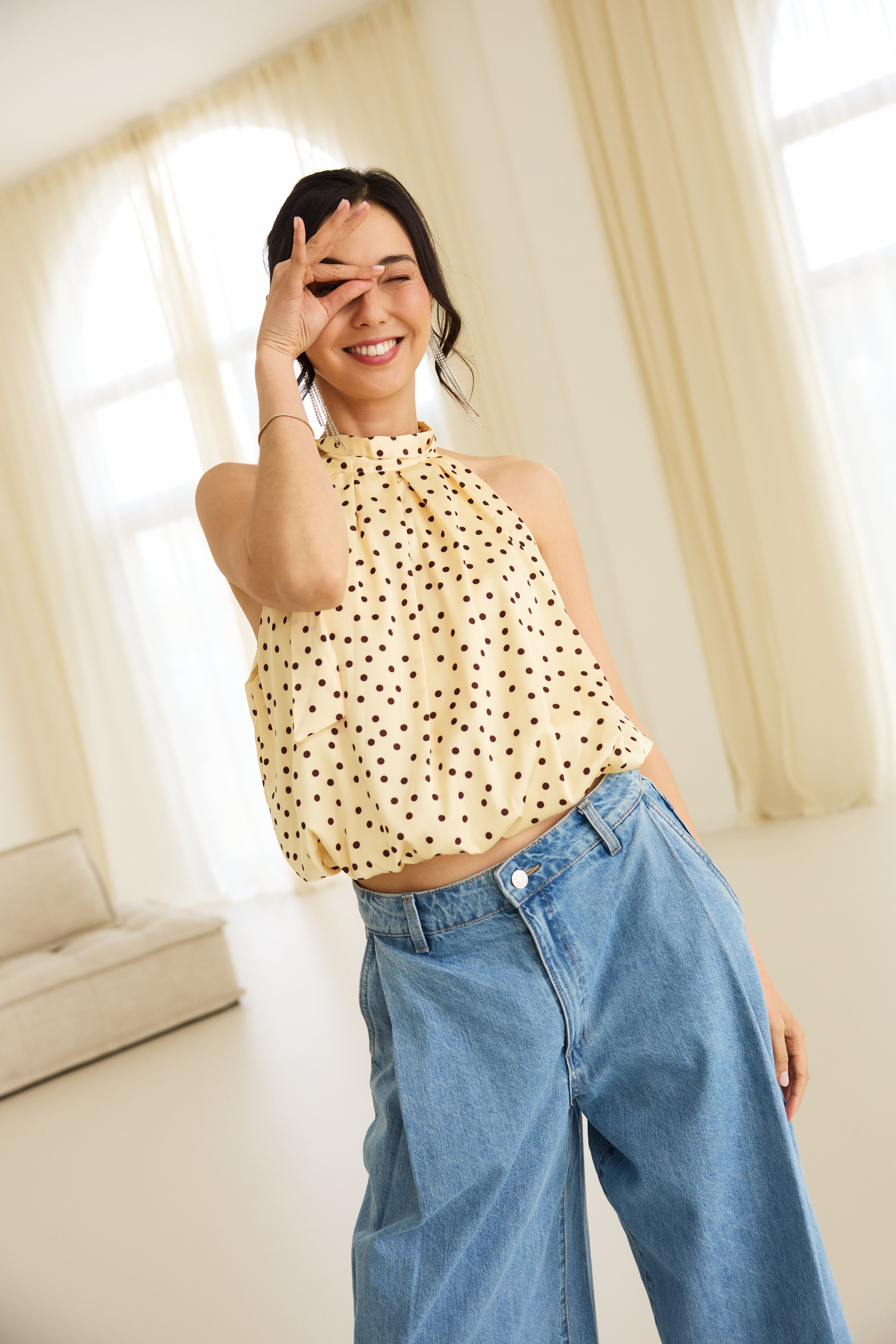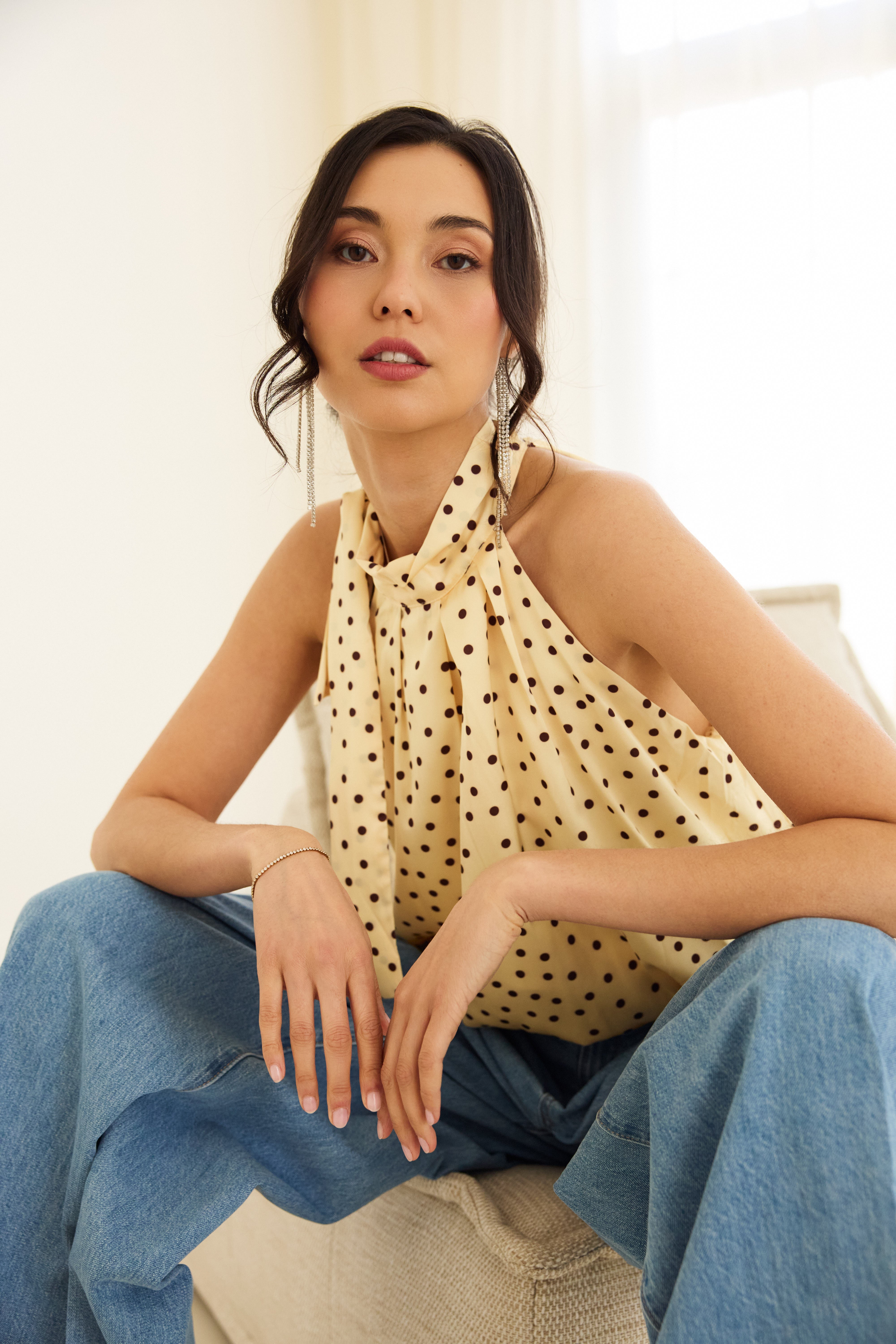 Brighten your wardrobe with the Gloria Top in cheerful lemon yellow adorned with playful polka dots. This fresh, fruity-inspired piece brings a burst of sunshine to any outfit, perfect for casual days or weekend adventures. The classic polka dot pattern adds a timeless touch of whimsy, while the vibrant color keeps things modern and fun. Effortlessly stylish and endlessly versatile.