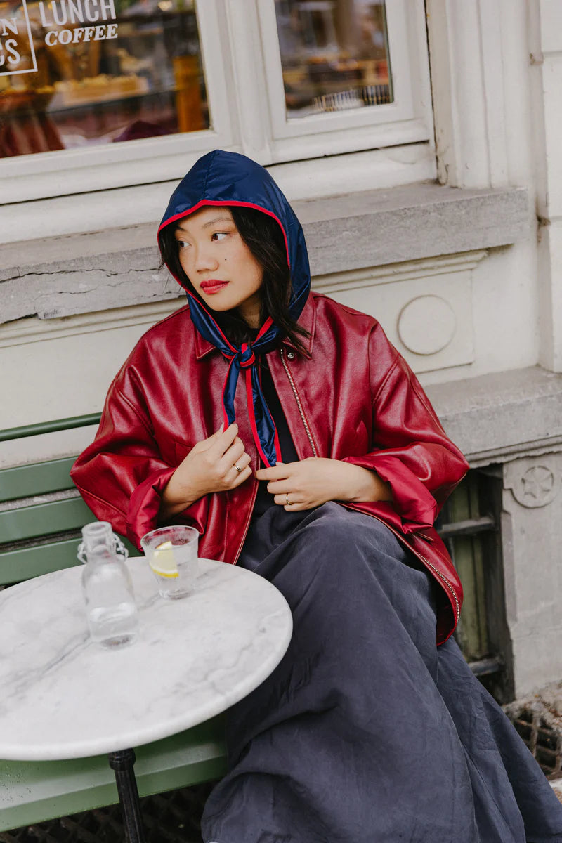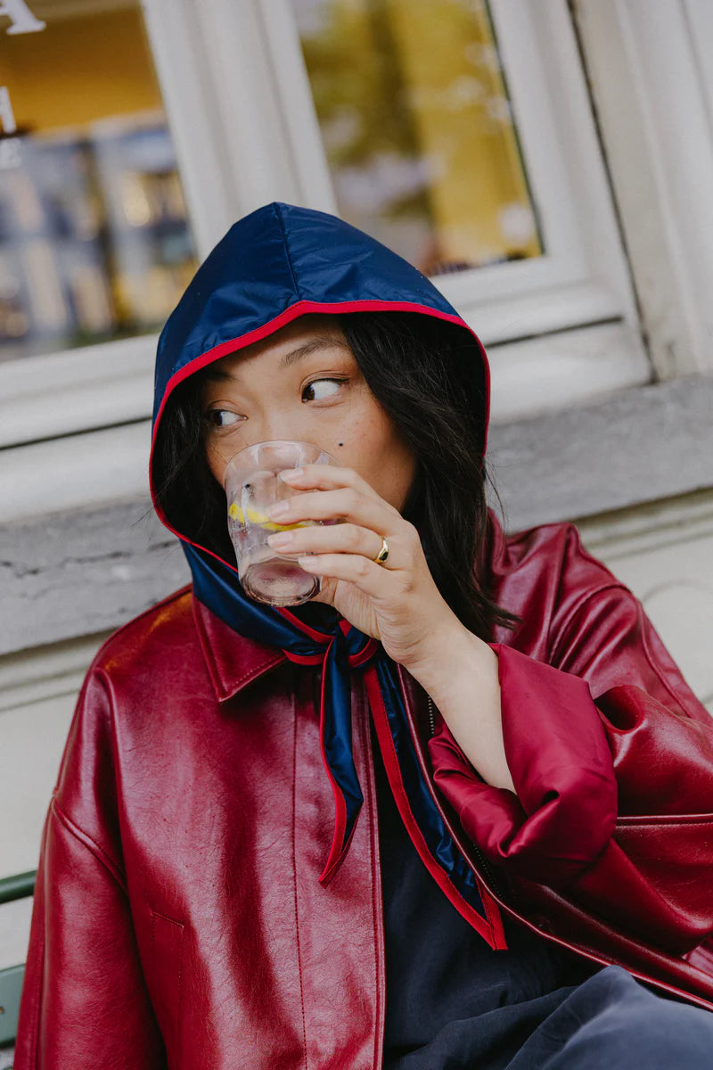 The Julia RAINCAP is made from a matte navy fabric by Burberry, with a cherry red edge.