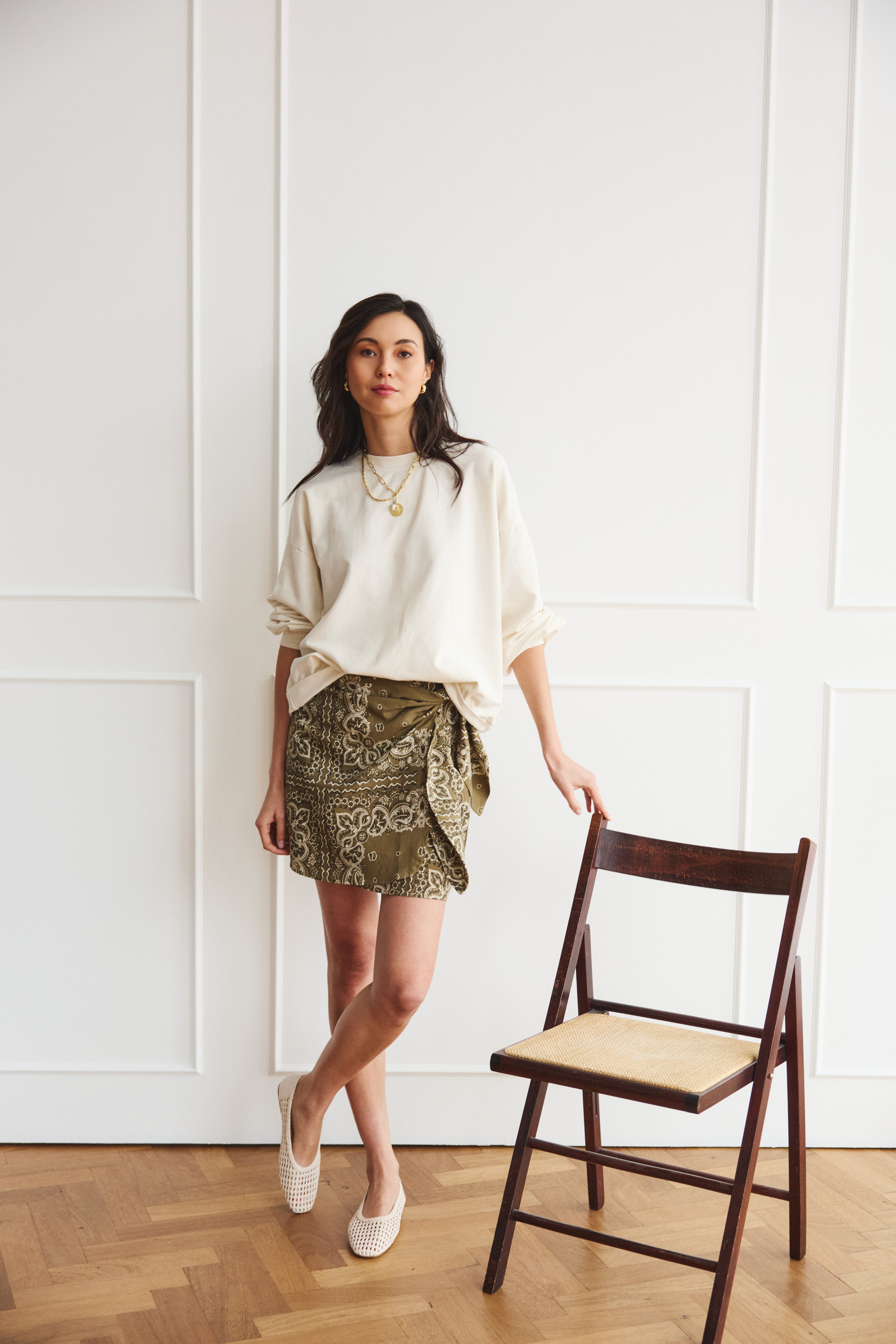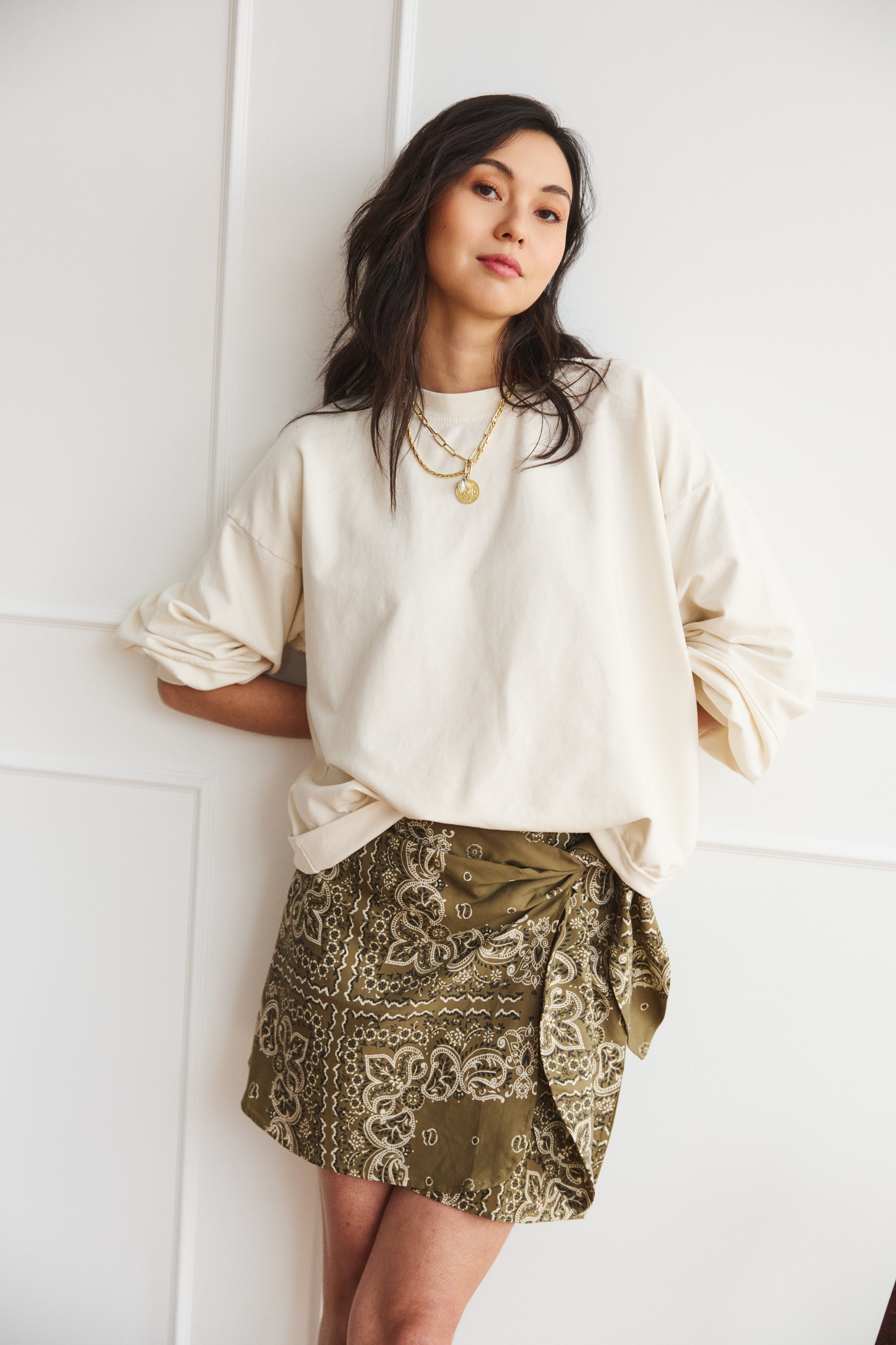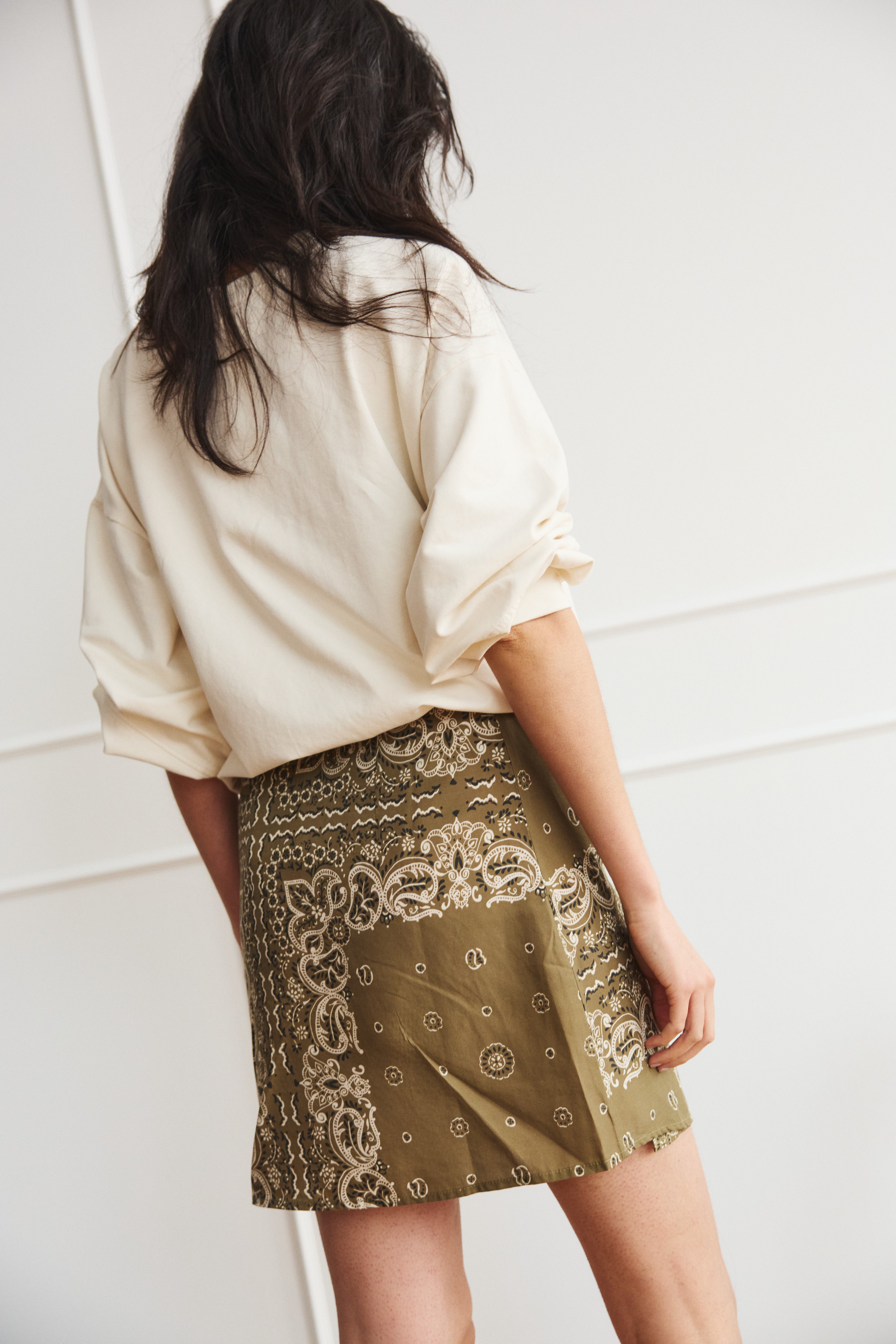 Wrap style skirt in soft, fluid tencel with a front overlap and hidden button closure for a clean finish. Features a beautiful bandana print that adds character, making it an easy and versatile piece to pair with the matching shirt.